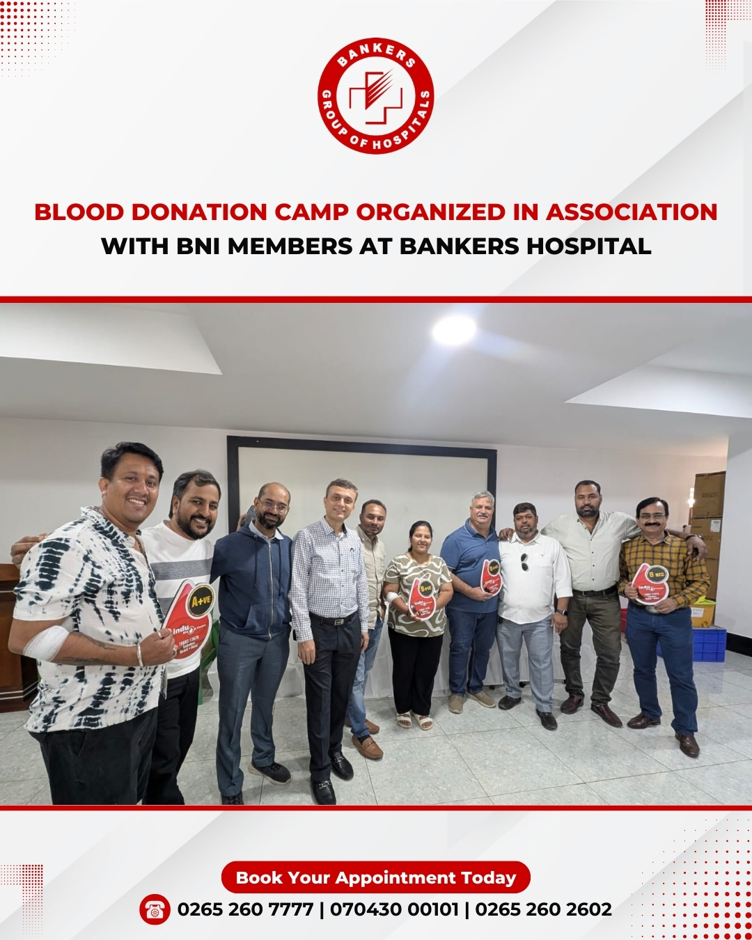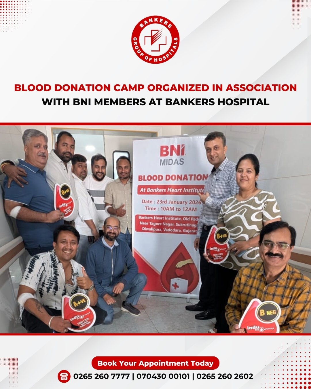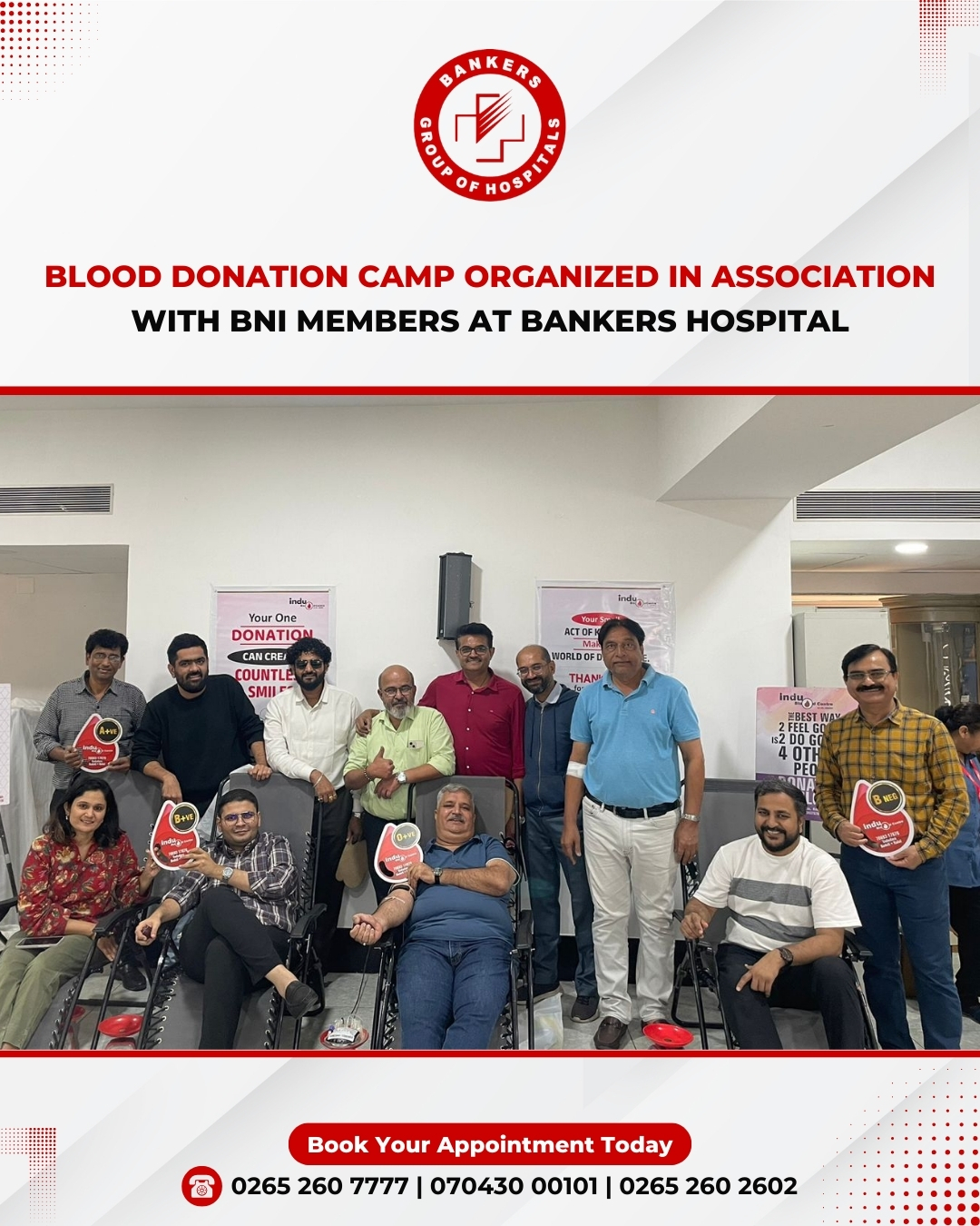 We are pleased to announce the noteworthy completion of CSR noble initiative - Blood Donation Camp, a collaborative effort between Bankers Group of Hospitals, Vadodara Realtors Association(VRA) , and Indu Blood Bank Centre. Heartfelt appreciation to all the donors- Bankers Staff & members of the Vadodara Realtors Association for their incredible generosity and spirit. Special thanks to the Indu Team for their outstanding support. To commemorate this noble cause, Bankers Heart Institute conducted a free check-up camp for the blood donors , extending our commitment to community welfare.More than 100 donors participated in this life saving initiative.