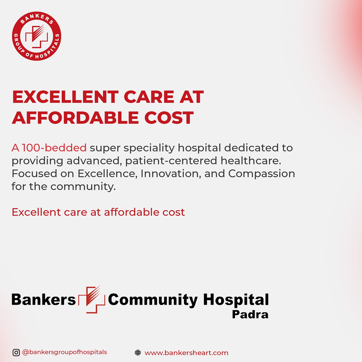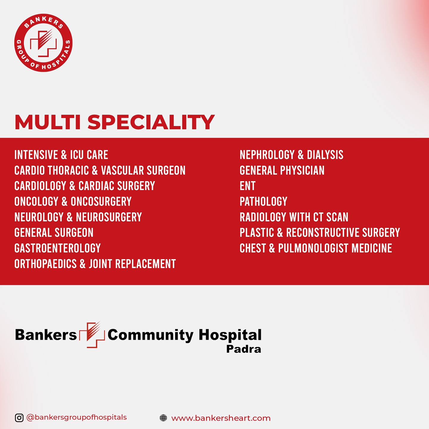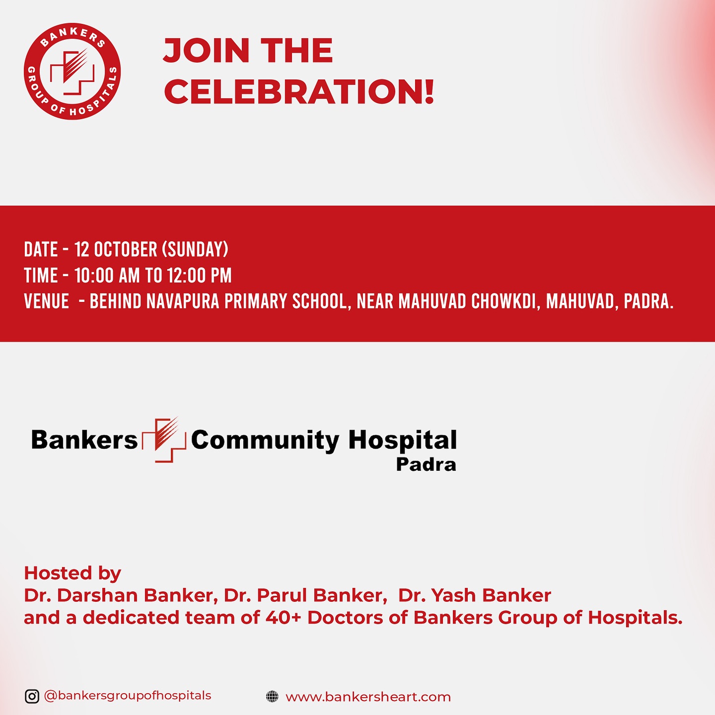 We are overjoyed to announce the GRAND INAUGURATION of the Bankers Community Hospital, Padra on Sunday, October 12th!
