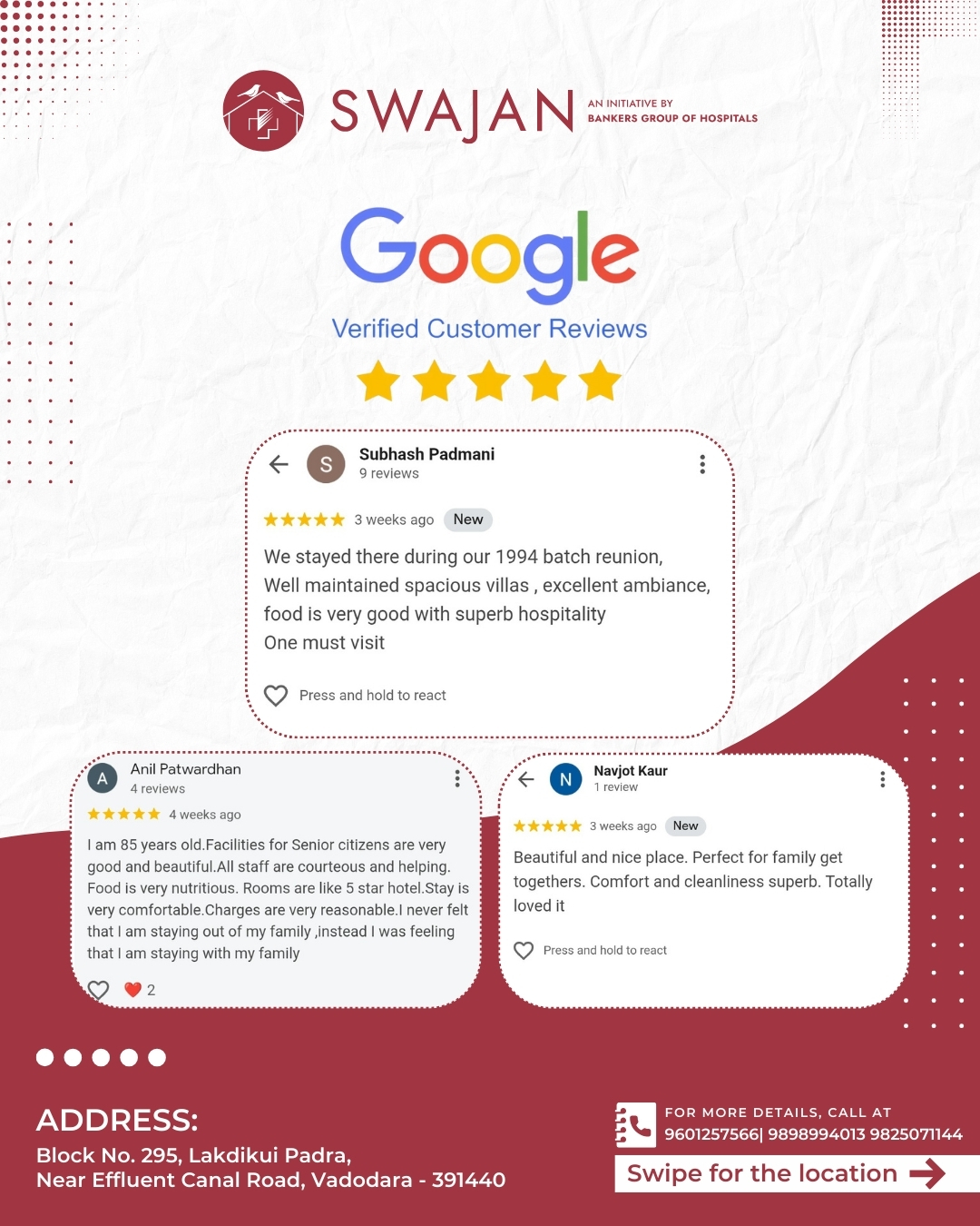 At Swajan, we strive to create an environment that feels less like a facility and more like home. We are deeply grateful to our guests for sharing their 5-star experiences and for trusting the vision of Bankers Group of Hospitals. Connect with us to book a property tour.