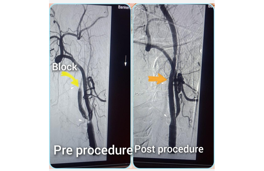 A brain MRI suggested an acute CV stroke with right internal carotid artery occlusion. Fortunately, the family had acted fast, and the patient was still within the window period for performing Mechanical Thrombectomy. The team proceeded with this procedure, followed by an angioplasty of the right ICA (a major blood vessel in the neck that carries blood from the heart to the brain).